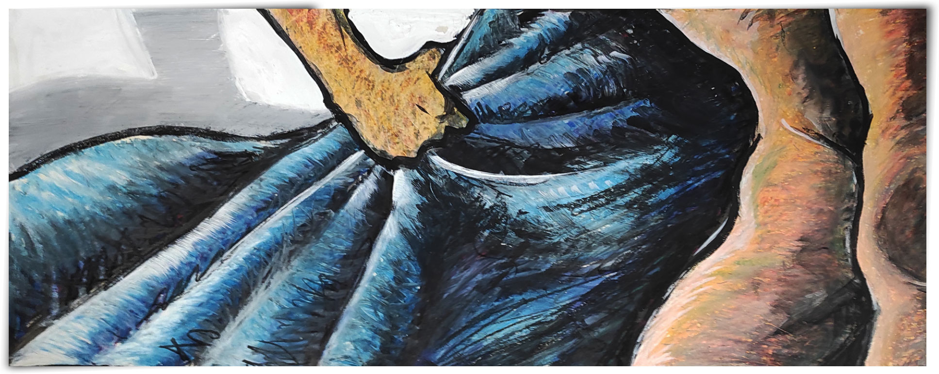 ocean drapé Hommage à Egon Schiele, focus ""orgasme non-interrompus". Format : 83,5x34 cm (image) Technique : Mixte (craies grasses, encre de chine, cirage) Support : carte parcheminée 300g Reproduction : 50x70 cm ou 30x40 cm, couché satin 250g (sur commande)