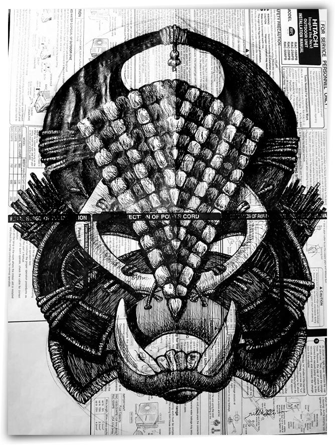 Predator Chasseur émérite, voici le Prédator. Format : 57x 77 cm (cadre) Technique : Encre Support : Notice technique Reproduction : 50x70 cm ou 30x40 cm, couché satin 250g (sur commande)