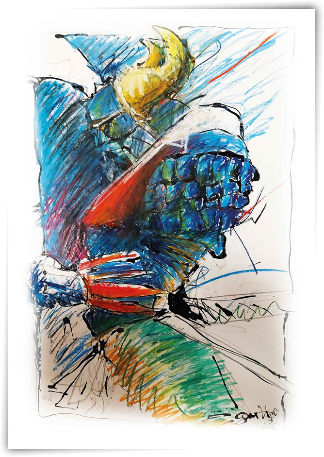 Goldorak esquisse 02 Esquisse libre. Un travail sur le Goldorak (version 10e siècle), en vieux guerrier. Format : 50x65 cm Technique : Craies grasses et encre de chine sur papier 200g Reproduction : 50x70 cm ou 30x40 cm, couché satin 250g (sur commande)